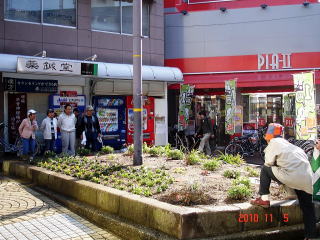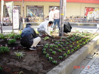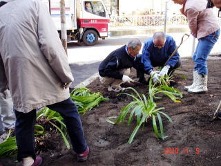 平成22年11月5日(金)9:00〜 チームのメンバーと(財)緑化協会事業課長、市道路公園室花みどり担当主幹をはじめ6名の応援を得て、昆陽南公園苗圃を活用する会代表の指示に基づいて植栽作業を行い、植栽講座の設計デザインどおりに完成しました。 皆さんありがとうございました。バンザーイ!