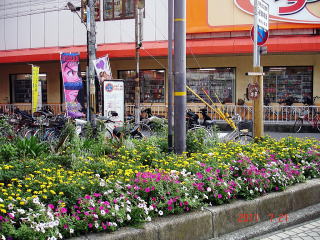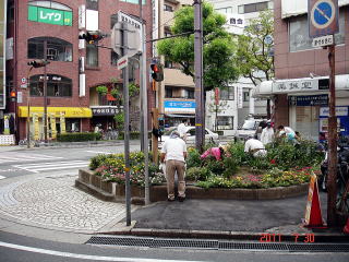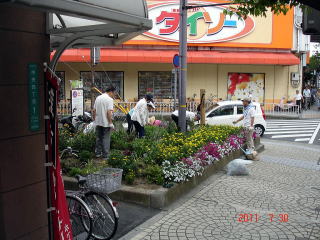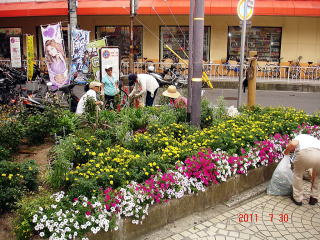 | 除草・花柄摘み作業 平成23年7月21日(木)17:00〜 ポケットかだん中央にて 「ポケットかだん中央」は色とりどりの夏の花が咲き誇っています。植え替え、補植後の数週間で花卉類はこれほど繁茂するかと驚くべき状態でした。 除草と花柄摘みを終えた後、暑気払いに繰り出しました。「ポケットかだん中央」の今後の取組について話が盛り上がり、あっという間の2時間半でした。 |